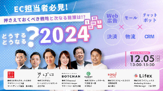 2024年を迎えるにあたり、EC事業者さまにとっては、物流問題に限らず、顧客の生涯価値(LTV)を向上させる方法についても検討が求められます。本セミナーでは、各業界のプロフェッショナルにご登壇いただき、2024年に向けた戦略策定にお役立ていただけるセミナーです。